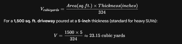 We use precision mathematics to eliminate waste and ensure consistent strength across large surfaces. For a standard residential driveway in Los Angeles and Ventura, we use the following volume calculation: